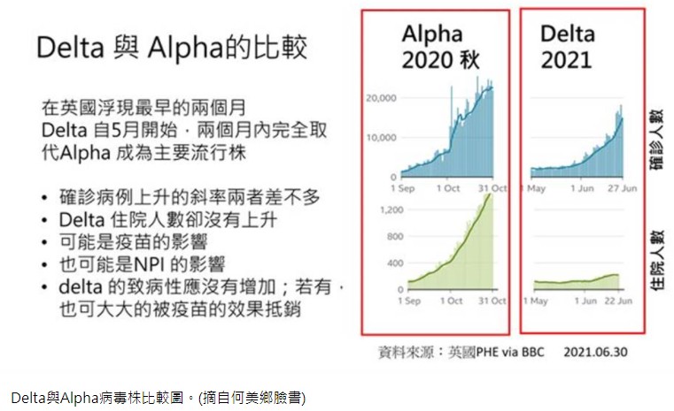 何美鄉說,Delta變異株從印度緣起,現在已散佈世界各地。在英國已取代Alpha變異株成為最重要的流行株種,比Alpha增加了60%的傳播性。由於Alpha已經比原生株的傳播性增加了50%,「所以,Delta的傳播性是原生株的兩倍以上。」