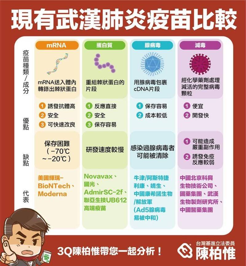 現有武漢肺炎疫苗比較。(圖:立委陳柏惟提供)