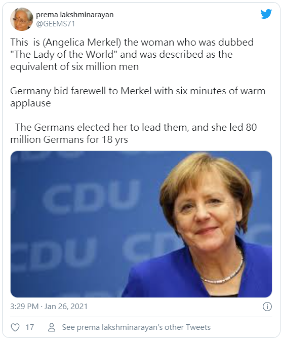 德國人以民主方式選舉她領導他們,她以能力、技巧、奉獻精神、正直和真誠領導了8000萬德國人18年。