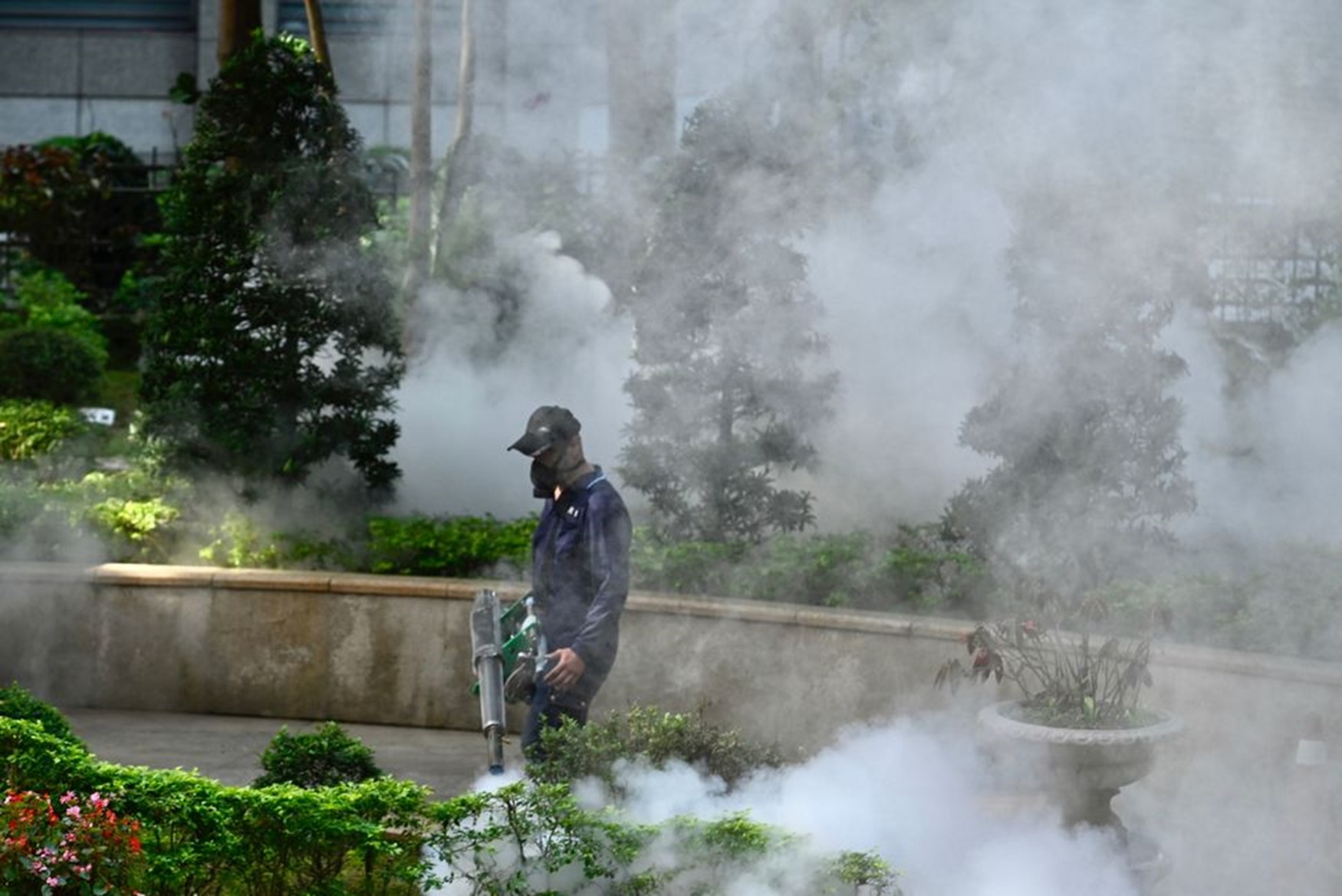 A mask-clad worker disinfects an area to prevent the spread of the COVID-19 coronavirus in the Xindian district in New Taipei City on March 9, 2020. (SAM YEH/AFP VIA GETTY IMAGES)