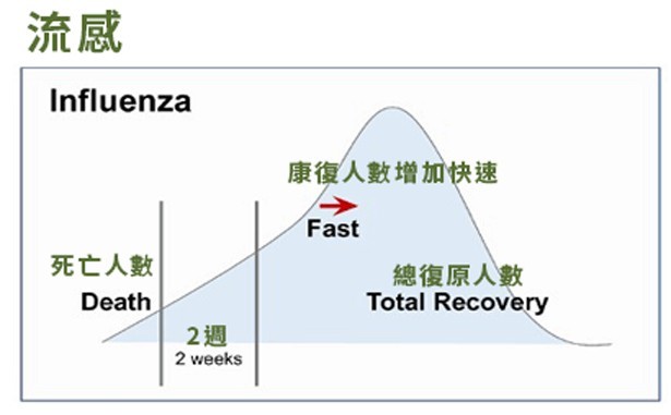 接下來張南驥分析流感病程之可能的鐘型線條,流感的總得病數字高,雖致死率較低,仍奪去相當多性命。只要短短二個星期,幾乎所有中間患病的人,都會向右移動,變成完全康復的狀態。