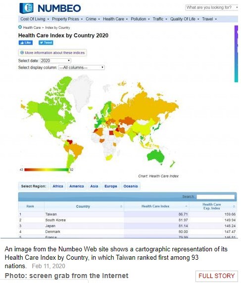 With a score of 86.71 out of 100, Taiwan ranked first among 93 countries, the Health Care Index by Country released by online database Numbeo showed.