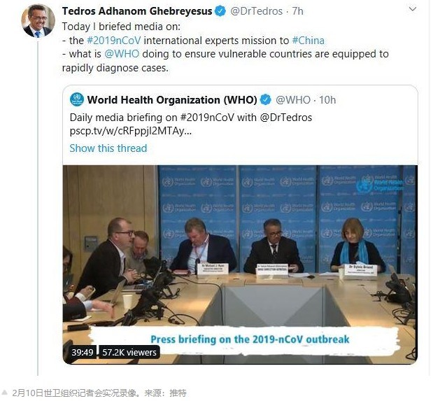 2月10日世卫组织专家组也抵达北京,与中国同行通力合作抗击全球疫情。此前(WHO)总干事谭德塞在记者会上表示,由布鲁斯·艾尔沃德(Bruce Aylward)博士带领的先遣组将和中国的医学专家一起,确保大家拥有抗击新冠肺炎疫情所需的所有专业知识。
