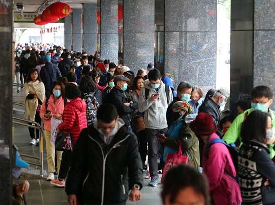批發連鎖店「光南」上午免費發放50萬片口罩,鄰近台北車站門市前排隊人潮長達數百公尺。 記者林澔一/攝影