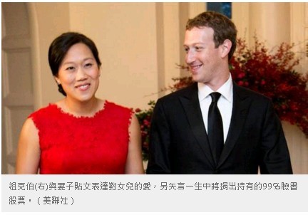 全球最大社群網站「臉書」執行長祖克伯1日下午透過臉書貼文表示,自己與妻子普莉希亞‧陳(Priscilla Chan)一生之中,將把一家擁有的99%臉書持股捐獻出去,做慈善公益;祖克伯貼文中另宣布,女兒麥克絲(Max)的誕生,帶給夫婦倆未來的希望。